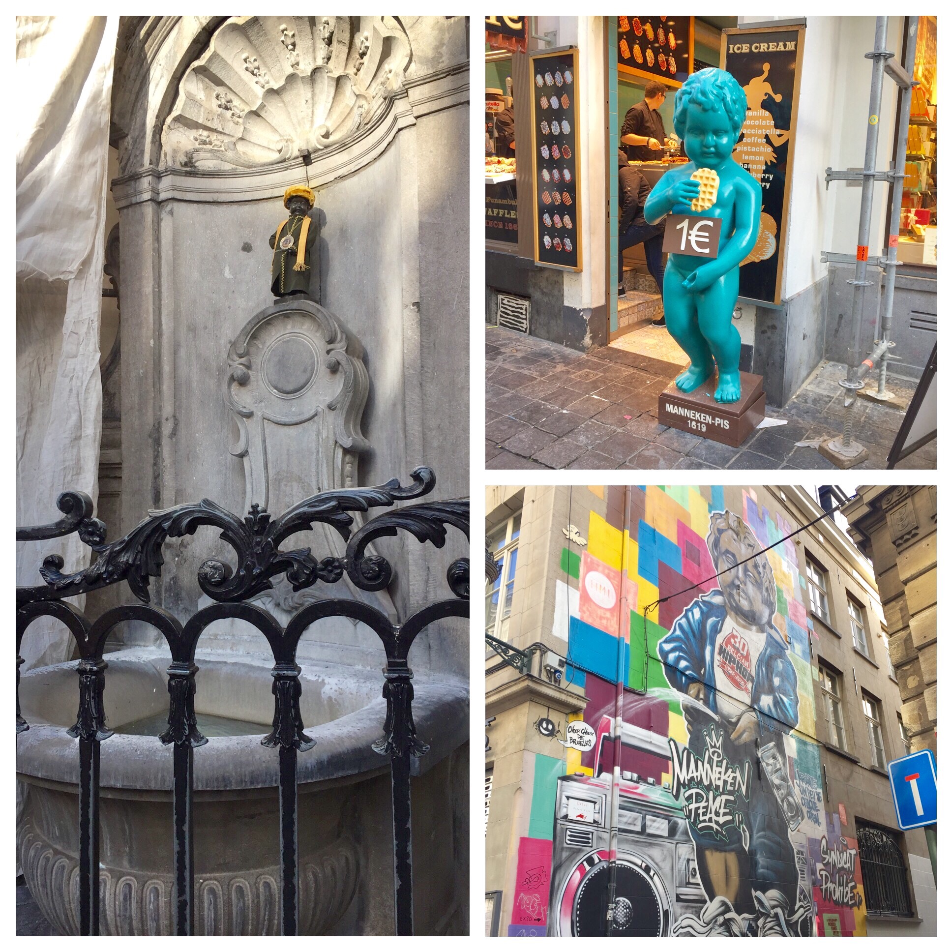 My first stop in Brussels was the famous Grand Place square, but my second was the almost-as-famous statue of a boy peeing into a fountain, in which Brussels takes a bizarre amount of pride. Mannekin Pis, as he is named, is regularly dressed in different costumes, and an entire museum in the city center is dedicated to his wardrobe. Every tourist shop sells Mannekin Pis miniatures, every bakery has his likeness advertising their waffles, and his image covers the streets in posters, art, and more.